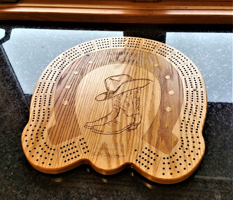 Custom Horseshoe with Boots and Hat Cribbage Board