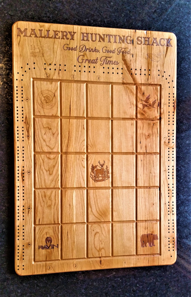 8. Personalized. Top of board, middle card, back side. I send you a photo of my design screen (before laser engraving) for you to review the font, artwork, and layout.