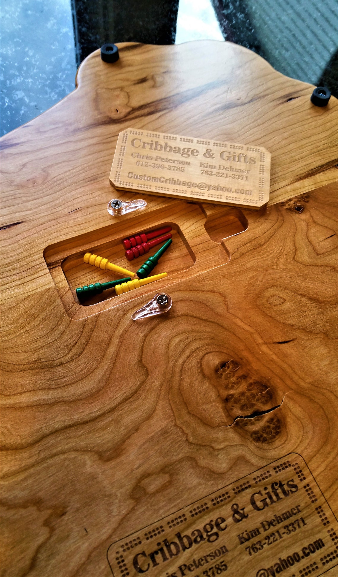 7. Peg storage with cover on back side. Includes three (3) sets of different colored scoring pegs.